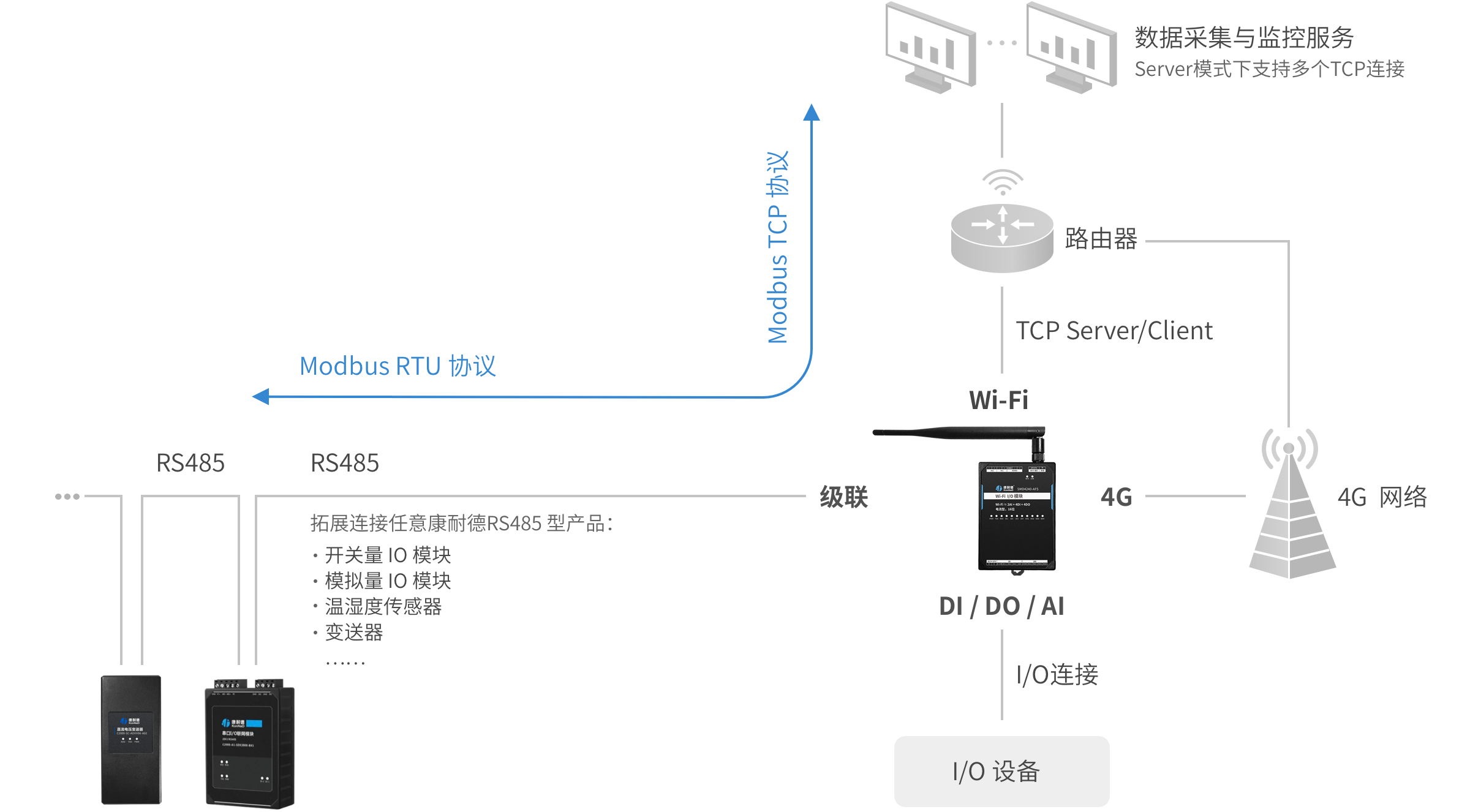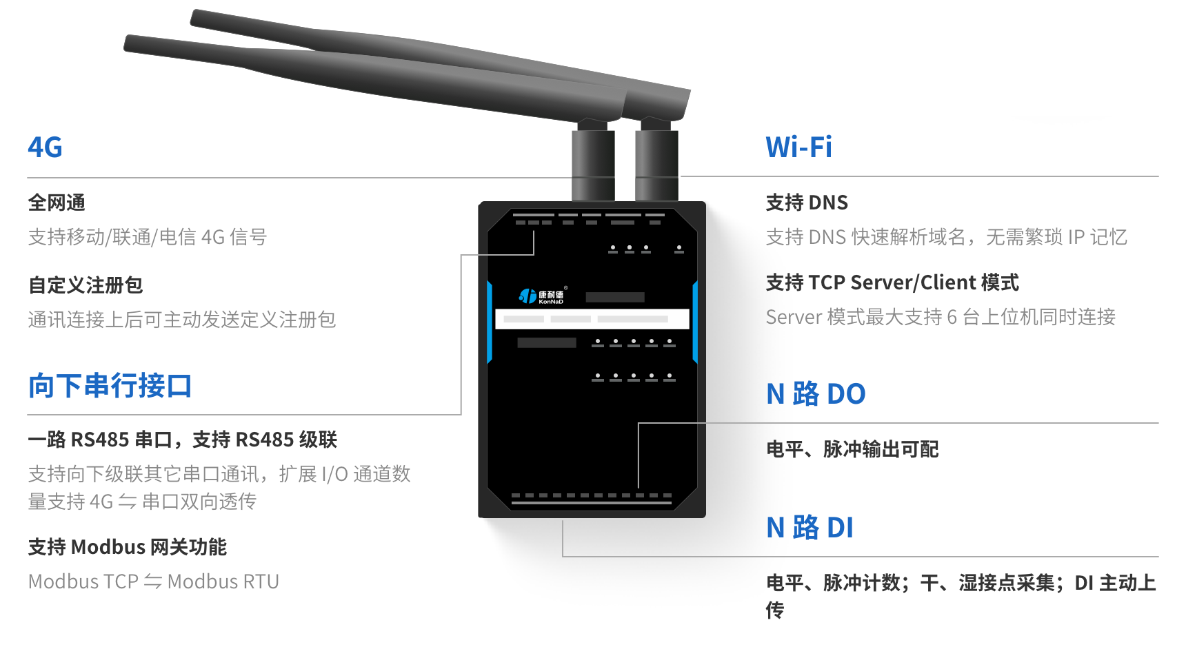 对上提供 4G无线传输,实现开关量、模拟量数据的远程采集传输与控制