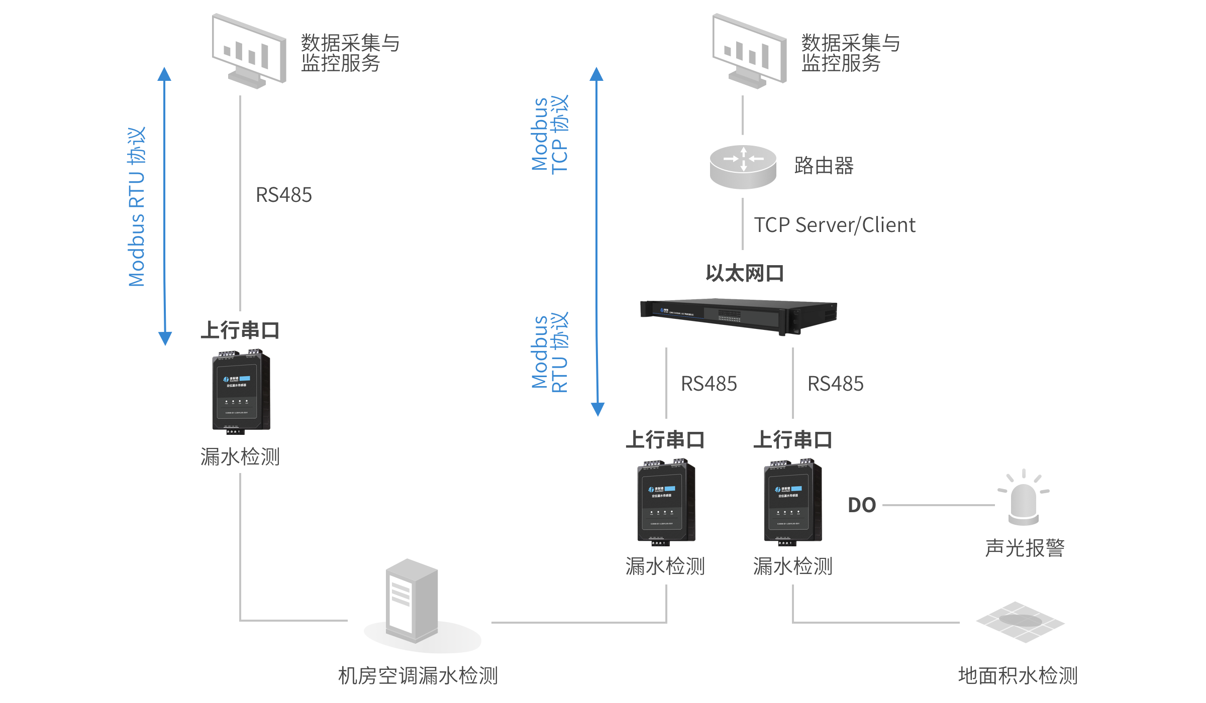 对上提供 1 路 RS485 通信接口,实现漏水情况、漏水位置等状态检测功能
